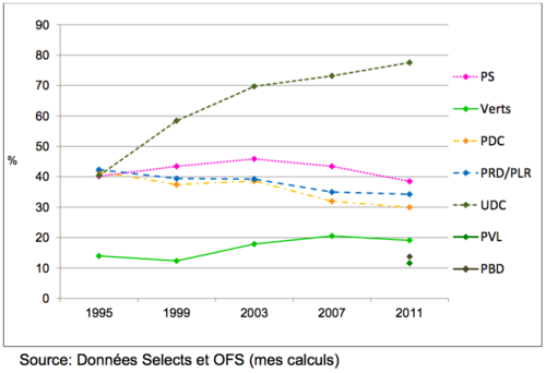 Ce que l’on voit ici est l’extrêmement forte augmentation du taux de concrétisation de l’UDC. En 1995, en 1999, en 2003, même en 2011 l’UDC a pu augmenter quasi systématiquement son taux de concrétisation. Autrement dit, l’UDC a pu augmenter quasi systématiquement sa capacité à mobiliser son électorat potentiel. C’est la grande explication du succès de l’UDC. Ce n’est pas une augmentation de sa popularité au sein de l’électorat, l’UDC reste a peu près aussi populaire qu’il y a vingt ans, c’est-à-dire pas très populaire mais par contre, les gens qui s’imaginent voter UDC votent effectivement UDC beaucoup plus fortement que les autres partis. Le taux de concrétisation des autres partis dépasse à peine 40% et même moins de 20% pour les Vers ce qui est un très fort contraste avec ce que l’on observe pour l’UDC. | Ce que l’on voit ici est l’extrêmement forte augmentation du taux de concrétisation de l’UDC. En 1995, en 1999, en 2003, même en 2011 l’UDC a pu augmenter quasi systématiquement son taux de concrétisation. Autrement dit, l’UDC a pu augmenter quasi systématiquement sa capacité à mobiliser son électorat potentiel. C’est la grande explication du succès de l’UDC. Ce n’est pas une augmentation de sa popularité au sein de l’électorat, l’UDC reste a peu près aussi populaire qu’il y a vingt ans, c’est-à-dire pas très populaire mais par contre, les gens qui s’imaginent voter UDC votent effectivement UDC beaucoup plus fortement que les autres partis. Le taux de concrétisation des autres partis dépasse à peine 40% et même moins de 20% pour les Vers ce qui est un très fort contraste avec ce que l’on observe pour l’UDC. | ||